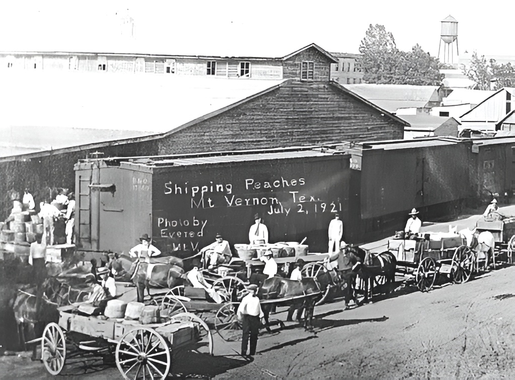 And bear they did. In a 1920 edition of the Mt. Vernon Optic Herald, an adorable Miss Margaret, the poster girl for peach growers, poses on a ladder. The caption reads, “More than twelve bushels of peaches were picked from this tree near Mt. Vernon.” On the annual “Peach Day” harvest-time shipments between one hundred and two hundred fifty railroad cars typically left our depot loaded with peaches. Historical figures in the Optic’s October 12, 1934, Anniversary Edition reveal record shipments “about the year 1920” of four hundred forty cars!